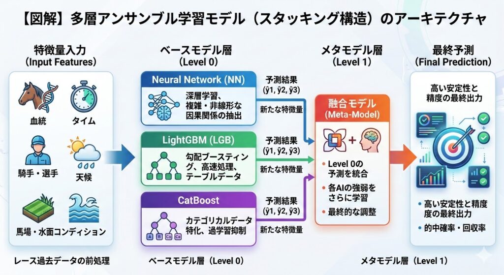 当プロジェクトで採用している予測モデルは、単一のアルゴリズムではなく、特性の異なる複数の強力な機械学習モデルを組み合わせた「多層アンサンブル学習(スタッキング)」という高度な手法を用いています。